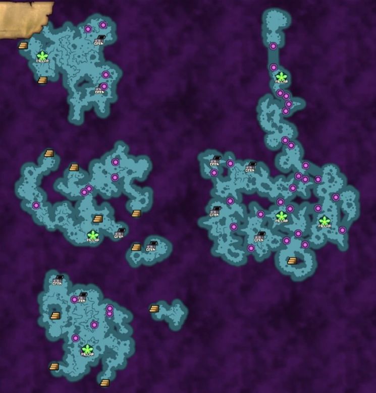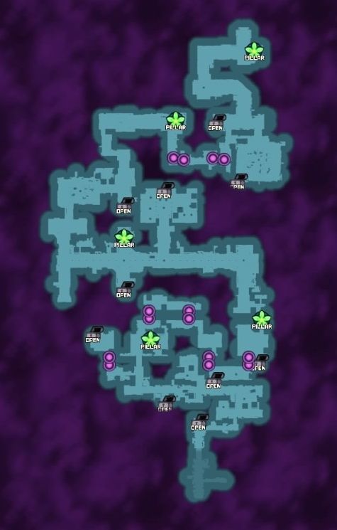 ひとまずのラストダンジョン。まずはすぐ右手に見えるピラーを咲かせるため、右の階段を進みましょう。何度かの階移動や仕掛けを経て、そのピラーにたどり着きます。